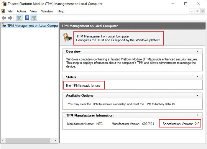 如果您看到「確認 TPM 已準備就緒的訊息,請檢查「TPM 製造商資訊」下的「規格版本」以確保其為 2.0 」。