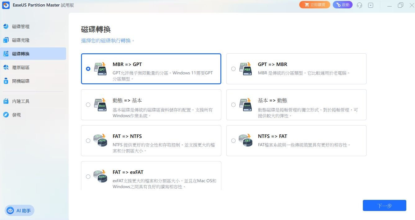 下載後安裝的流程很簡單,安裝後開啟程式,在左邊的「磁碟轉換」就可以看到「MBR => GPT」的功能選項。