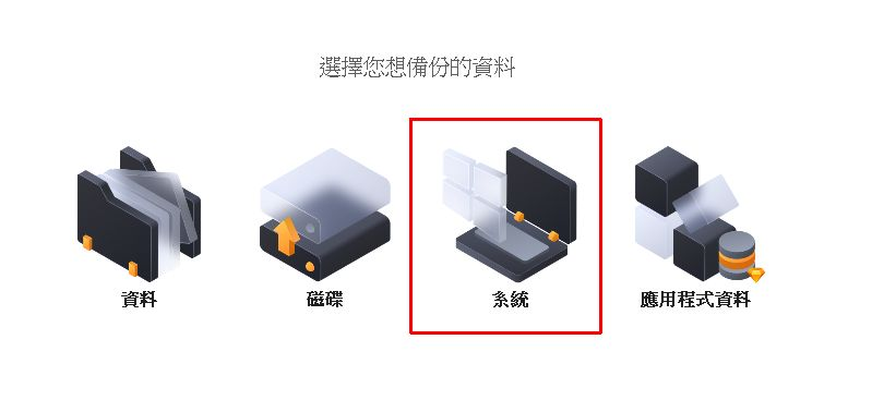 在程式啟動後,你會看到類似「系統備份」、「檔案備份」、「磁碟/分區備份」這樣的選項。