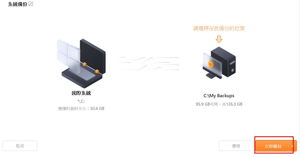 選擇要備份的系統和存放的位置,就可以開始備份了。
