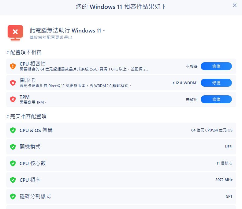 - 硬體相容性問題(最常見): 處理器(CPU)不支援, TPM 2.0 模組未啟用、Secure Boot 未啟用、磁碟格式為 MBR