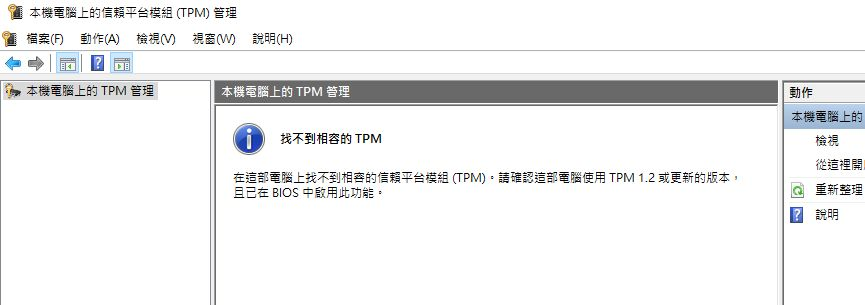 如果您未啟用 TPM,您可能會看到以下錯誤訊息「找不到相容的。在這部電腦上找不到相容的信賴平台模組 (TPM)。請確認這部電腦使用 TPM 1.2 或更新的版本,且已在 BIOS 中啟用此功能」。