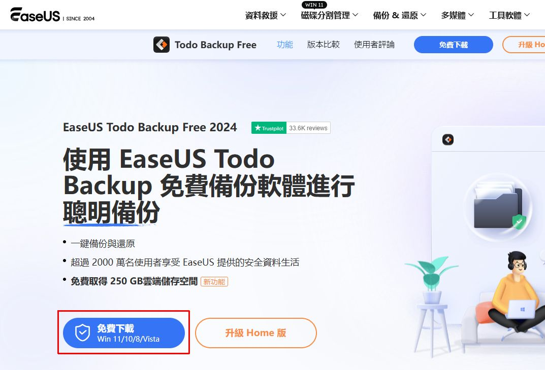 在 EaseUS Todo Backup Free 官網主頁上就可以找到「免費下載」連結。
